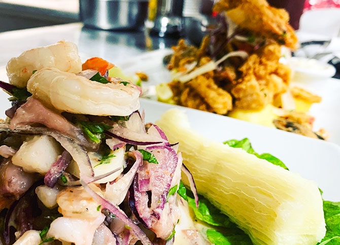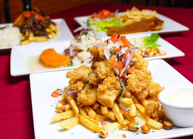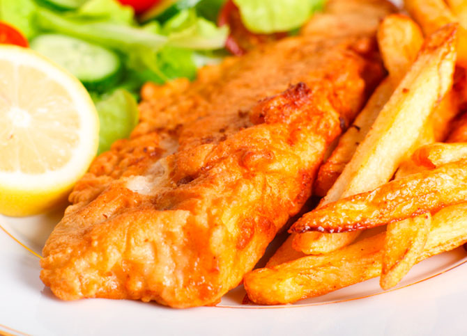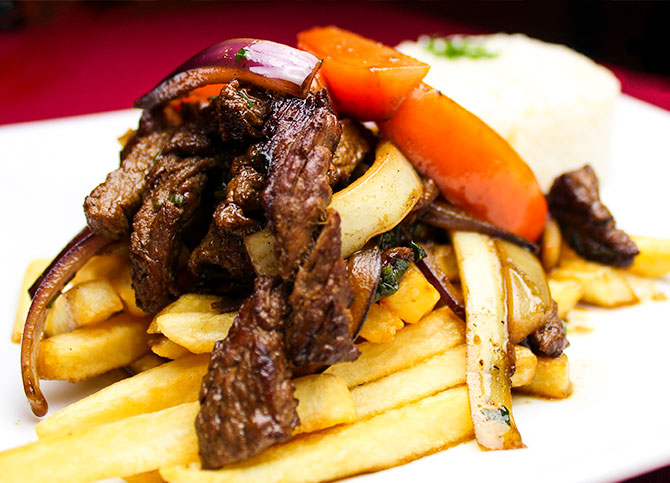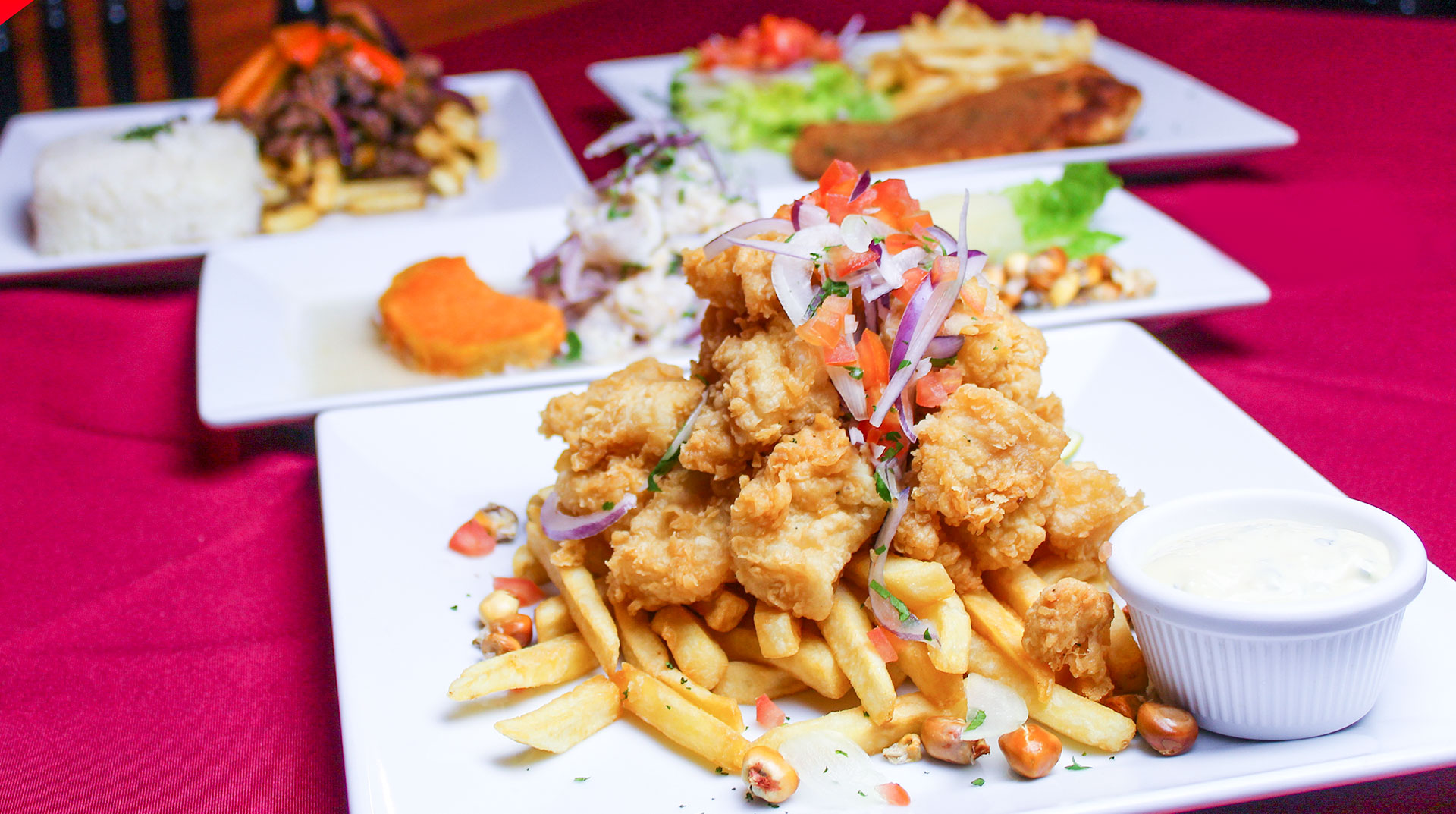Grilled chicken breast served with French fries, white rice, and a salad of lettuce,